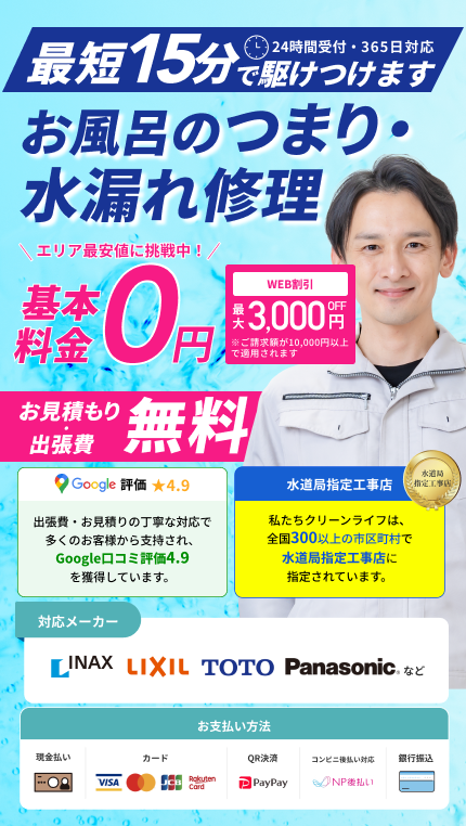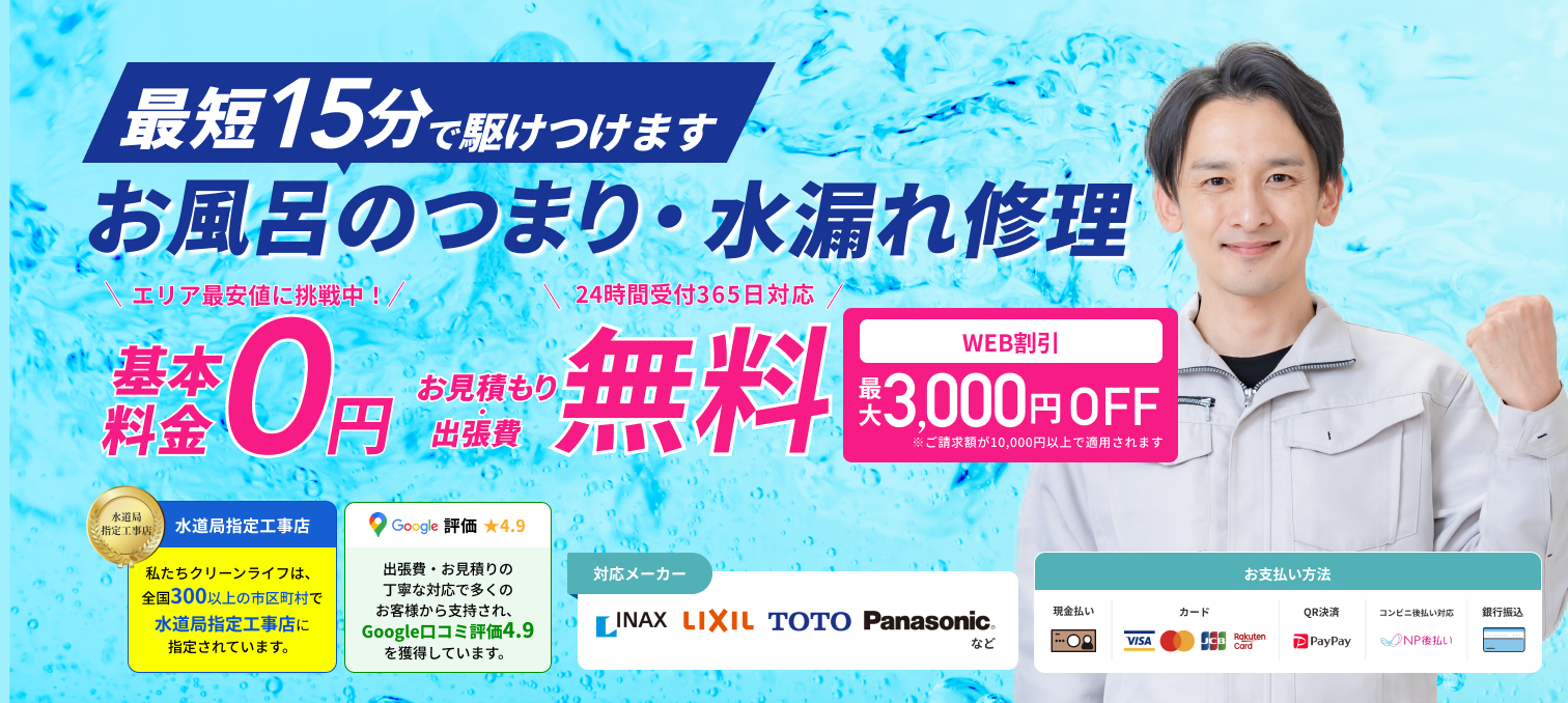 弊社クリーンライフは自社の作業員が徳島エリアの水道トラブルに駆けつけますので他の水道修理業者に比べて安い料金でお風呂の水漏れ、お風呂の詰まり、お風呂の異音・異臭、お風呂の水が止まらないのトラブルを解決致します。