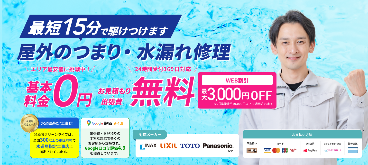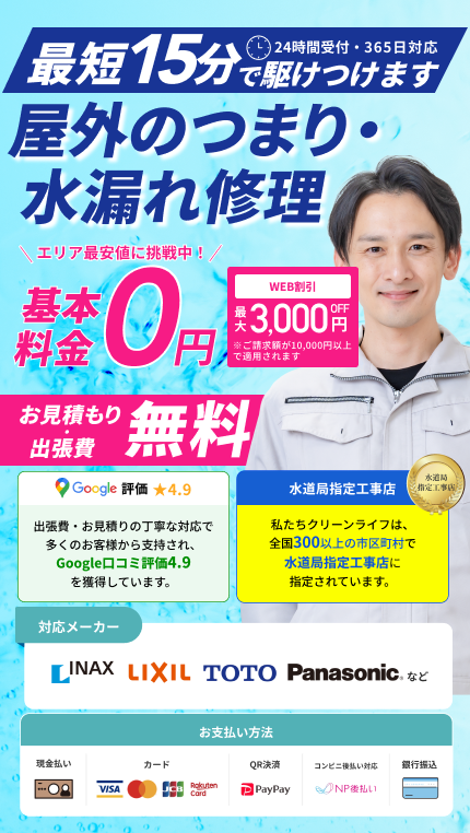 弊社クリーンライフは自社の作業員が徳島エリアの水道トラブルに駆けつけますので他の水道修理業者に比べて安い料金で屋外などの水漏れ、屋外などのつまり、屋外などの異音・異臭、屋外などの水が止まらないのトラブルを解決致します。